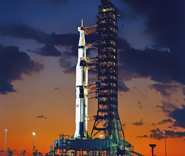 Lego Saturn V diorama with lighting, fog, audio, motion and automated effects.